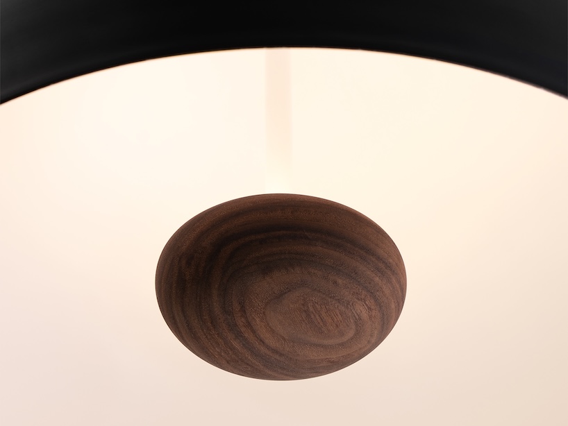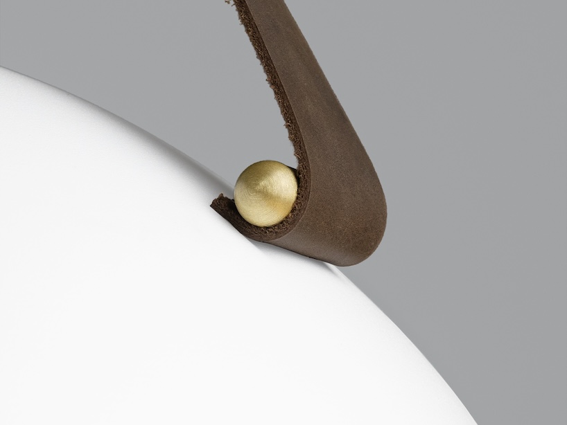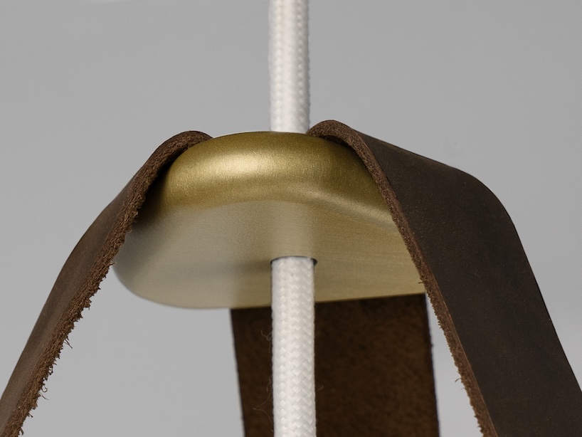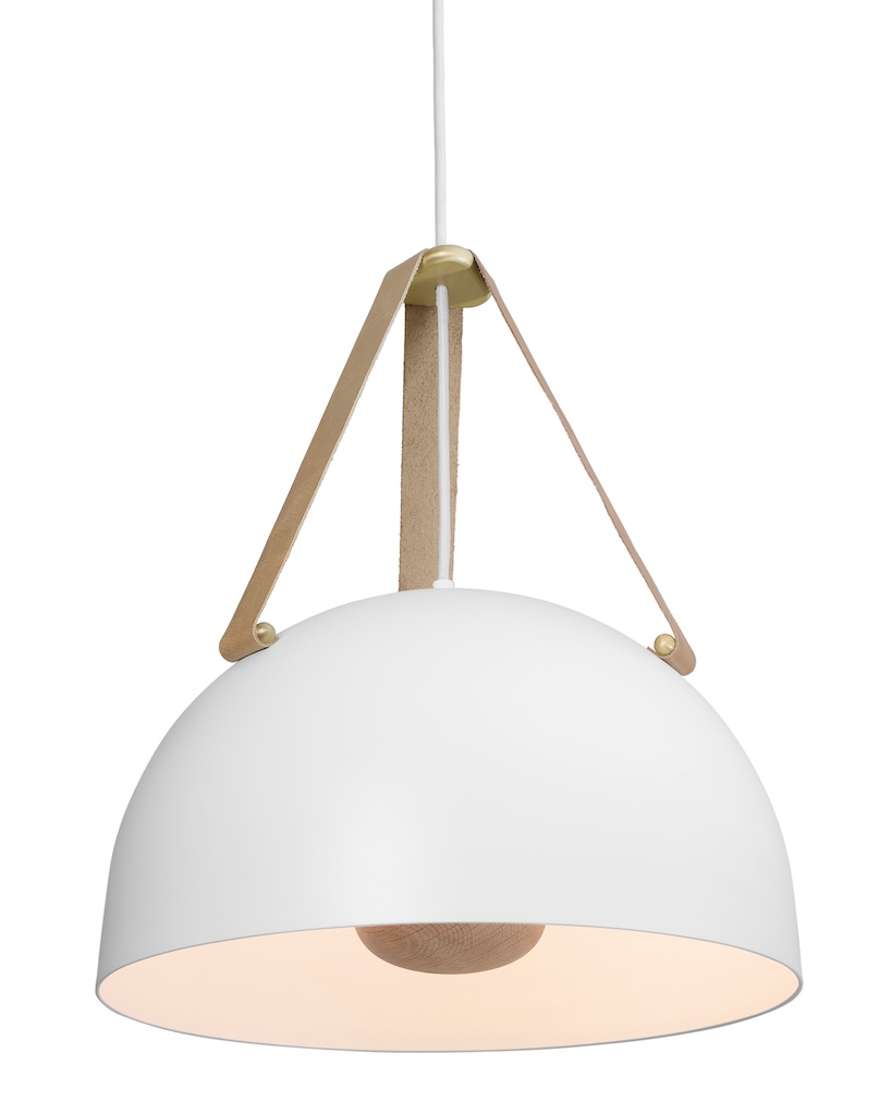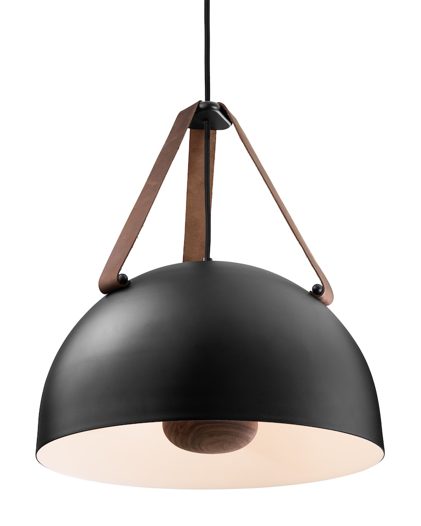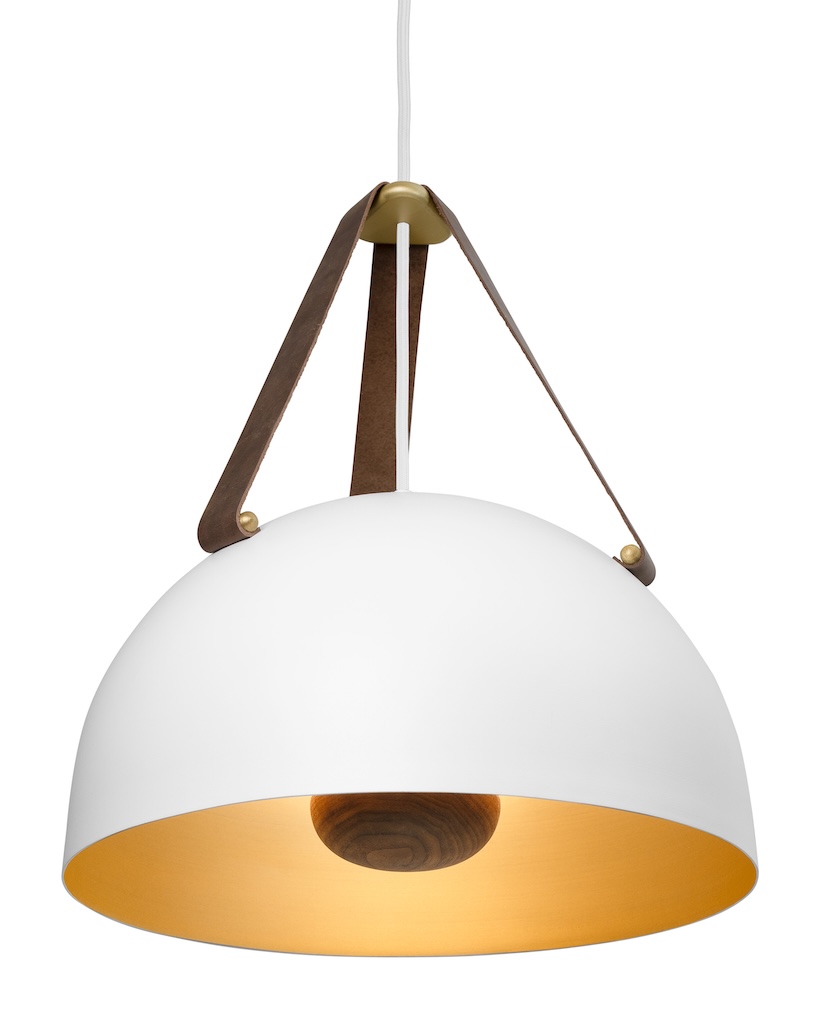 The Stillo 16’s domed natural wood hub mirrors the spinning it nests within, while the light source casts glare-free illumination. Rounded accent pins and a triangular top piece gather the three leather straps, ensuring a level hang and a balanced silhouette from every angle.