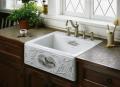 Decorated 19th century dinnerware serves as the inspiration for the elegant artistry of Tidings with Game Birds and Tidings designs. Tidings with Game Birds features pheasant pictorials-a look perfectly suited for an English Country décor. Tidings sets a serene, traditional tone with detailed relief carving on the Alcott apron-front sink.